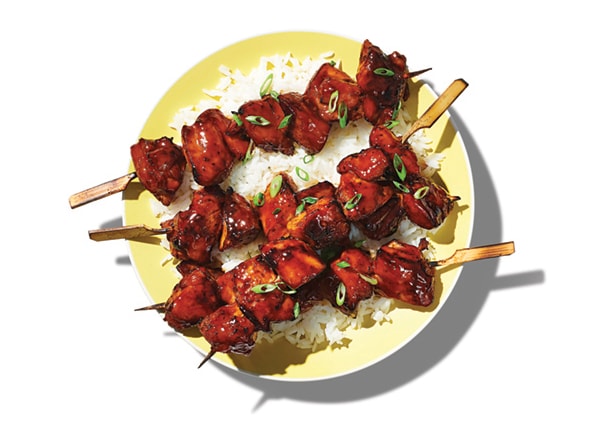 - Preheat grill (or grill pan) on medium. Remove skewers from baking dish (discard marinade) and coat with spray. Grill chicken 10–12 minutes, turning occasionally, until chicken is grill-marked and 165°F. Baste chicken with reserved sauce during last 2 minutes of grill time. Serve.