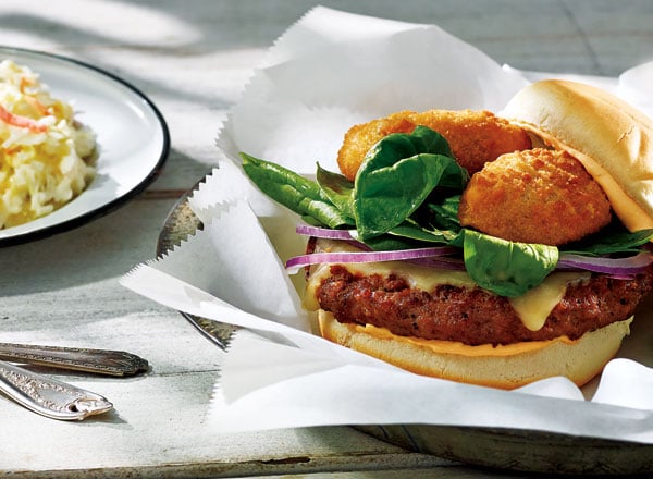 - Spread 2 teaspoons cream cheese inside each bun. Place burger patties on bottom halves of buns; top with onions, spinach, jalapeño poppers, and top halves of buns. Serve.