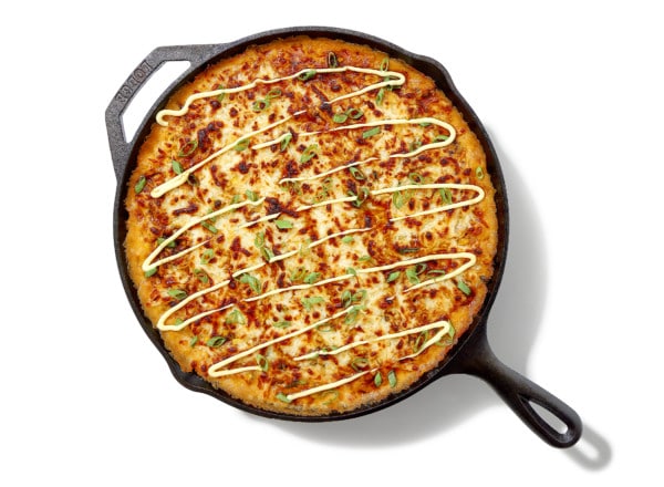 - Remove skillet from oven and increase heat to broil on HIGH. Top with remaining 12 oz mozzarella and return skillet to oven on center rack. Broil 3–5 minutes until cheese is melted and browned. Let stand 5 minutes. Top with reserved green onions; drizzle with mayonnaise and barbecue sauce, if using. Serve.
