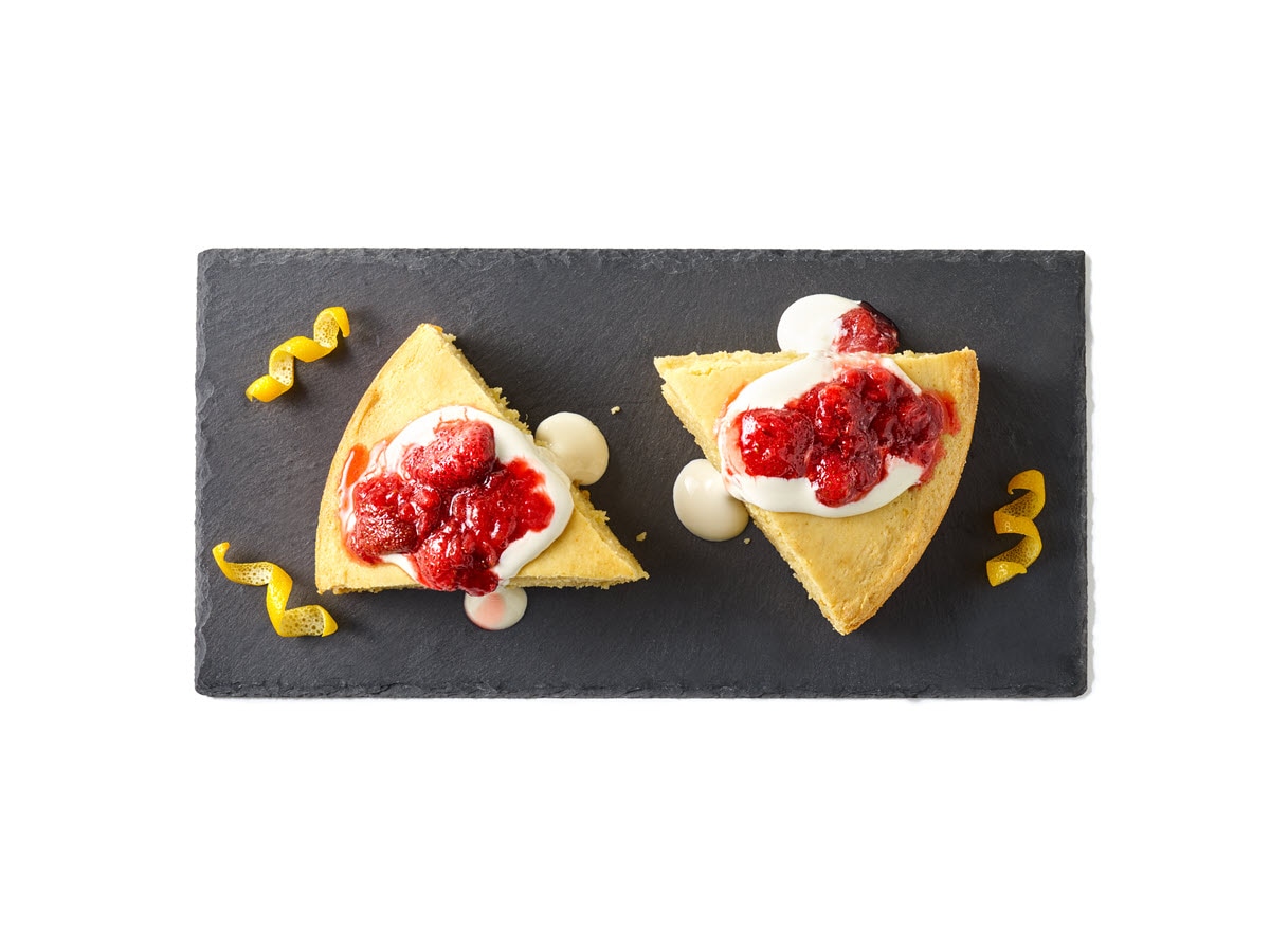- Place strawberries and remaining ¼ cup sugar and ¼ teaspoon salt in medium saucepan on medium. Cook 15–20 minutes, stirring occasionally, until berries have broken down and compote has thickened. Remove from heat and stir in remaining 1 tablespoon lemon juice and ½ teaspoon vanilla. Let stand to cool completely. Serve cake slices with berry compote and sour cream mixture.