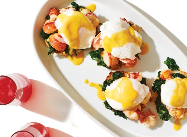 - To serve, slice English muffins in half and toast. Arrange toasted muffins on serving plates. Evenly top each half muffin with lobster, spinach, and 1 poached egg. Garnish with hollandaise sauce and serve immediately.