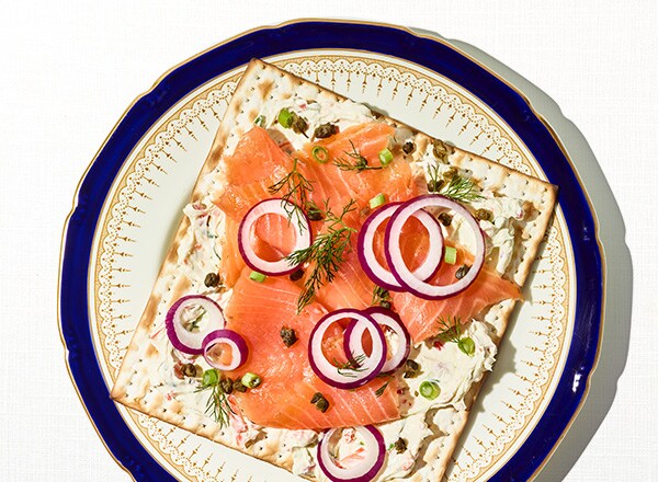 - Slice onion thinly; chop dill. Spread even amount cream cheese on each matzo cracker; top evenly with onions, dill, salmon, capers, and salt. Serve.