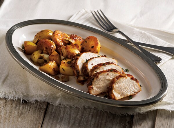 - Combine broth, syrup, mustard, vinegar, and 1 teaspoon thyme, then add to chicken; simmer 2–3 minutes or until mixture thickens and chicken is 165°F. Remove chicken from pan; let stand 5 minutes to rest. Return potatoes pan and stir to coat; sprinkle with remaining 1 teaspoon thyme. Slice chicken and serve with sauce and potatoes.