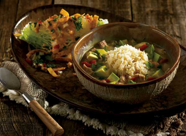 - Place rice in serving bowls; top with chili, avocado, cilantro, and olives. Serve.