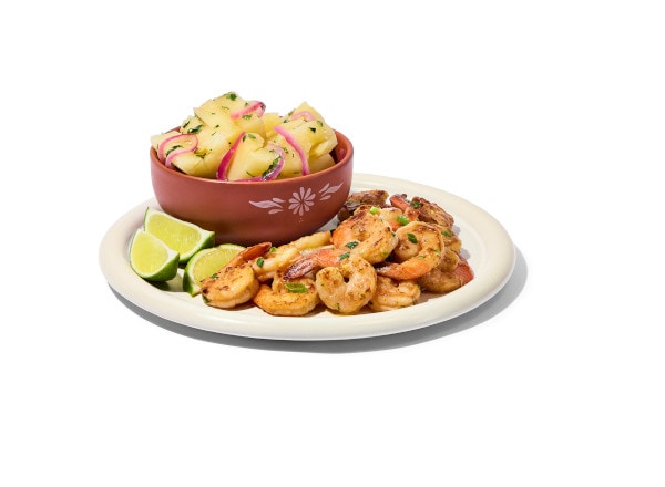 - Melt butter in large, nonstick sauté pan on medium 2–3 minutes. Add shrimp and cook 3–4 minutes, flipping occasionally, until shrimp are pink and opaque. Serve over Garlic-Onion Yucca; top with green onions, cilantro, and reserved mojo.