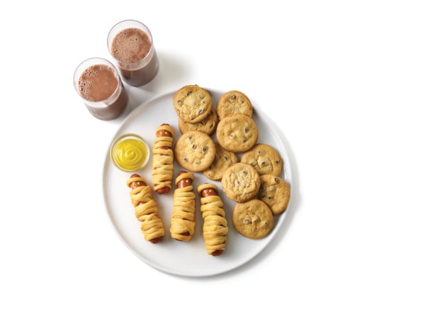 - Pull and stretch crescent dough strips, then wrap 2–3 strips around each hot dog, overlapping slightly and leaving small opening near end for eyes; tuck any loose dough behind hot dogs. Arrange on baking sheet about 2 inches apart.