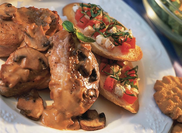 - Combine mayonnaise, soup mix, and garlic in large bowl. Slice pork diagonally into 12 (½-inch-thick) slices (wash hands). Stir pork slices and mushrooms into soup mixture.