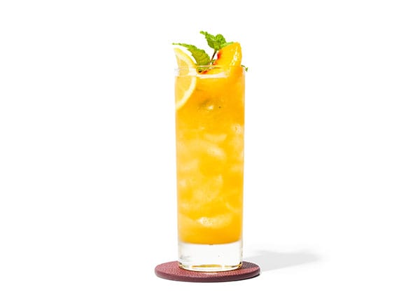 - Garnish with lemon wheel, peach slice, and mint sprig, if desired.
