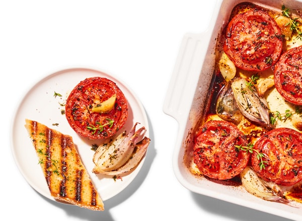 - Bake 18–20 minutes until tomatoes, shallots, and garlic are soft and browned. Serve with baguette slices, if using.
