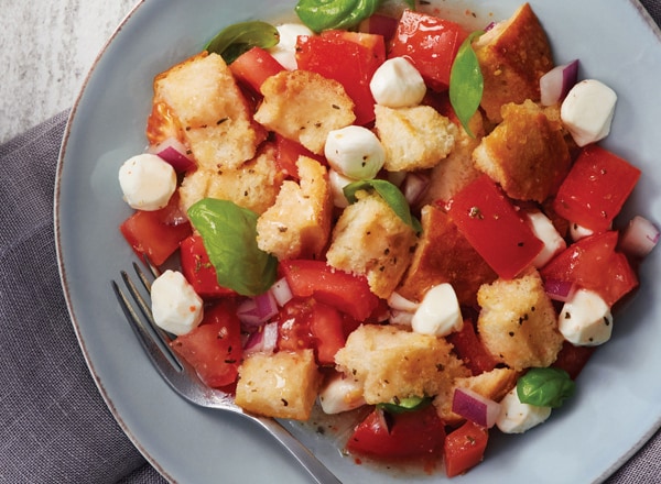 - Toss tomatoes, onions, and cheese with vinaigrette until coated. Add bread and basil leaves.