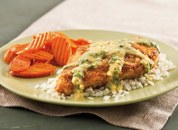 Amount per ¼ recipe serving: Calories 560, Total Fat 23g, Sat Fat 3.5g, Trans Fat 0g, Chol 65mg, Sodium 650mg, Total Carb 55g, Fiber 2g, Sugars 1g, Protein 30g, Calc 2%, Vitamin A 2%, Vitamin C 6%, Iron 15%