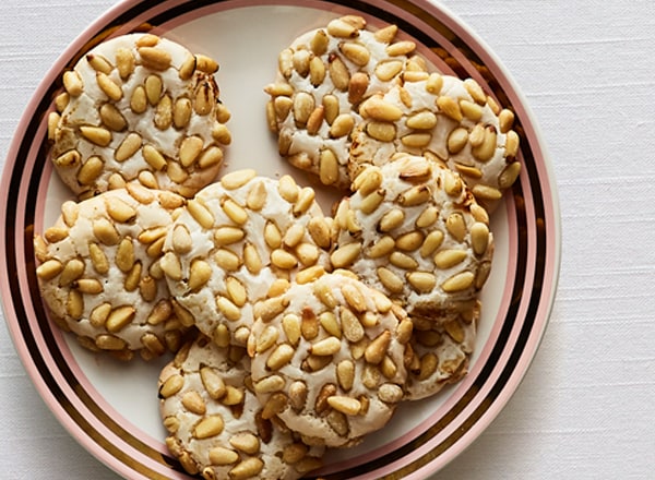 - Transfer batter to a large pastry bag fitted with ½-inch plain pastry tip. Pipe 1 ½-inch rounds (or spoon batter by the heaping tablespoonful) about 1 inch apart onto prepared baking sheets. Sprinkle each with 1 teaspoon pine nuts.