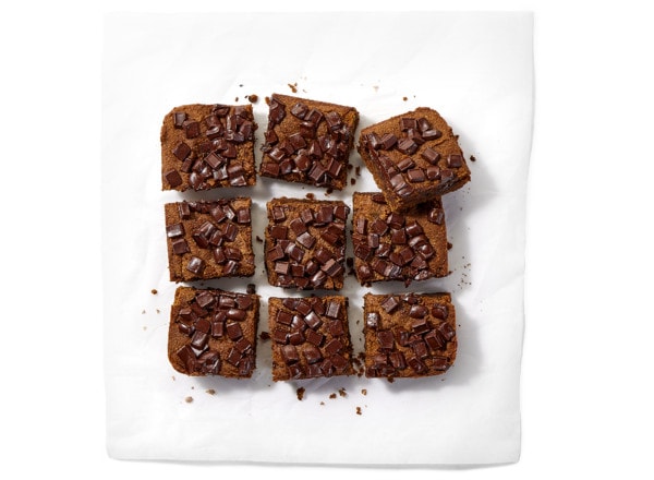 - Spread batter evenly into baking dish and top with remaining ½ cup chocolate chunks. Bake 25–30 minutes until center is just set. Let stand to cool completely in pan before removing and cutting into bars. Serve.