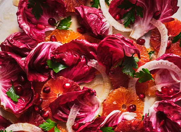 - Strain honey mixture through fine-mesh strainer; discard solids. Arrange oranges and fennel on top of radicchio. Sprinkle with pomegranate arils, salt, and parsley. Drizzle honey mixture and oil over salad; serve.