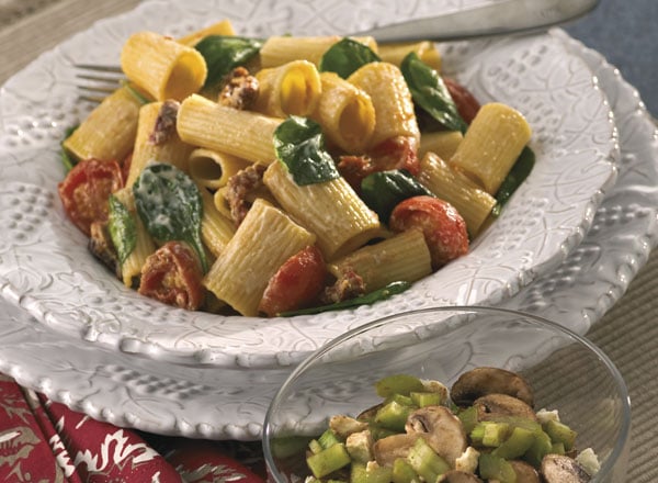 - Drain pasta; stir pasta into tomato mixture. Stir spinach in gently. Serve.