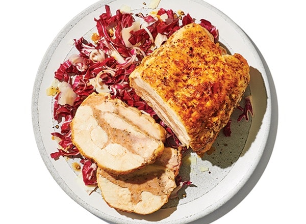 - Meanwhile, prepare salad. Finely shred radicchio; thinly slice shallot. Grate or shave cheese. Add to medium bowl: radicchio, shallot, cheese, vinegar, seasoned salt, and 2 tablespoons reserved pan drippings; toss to coat.