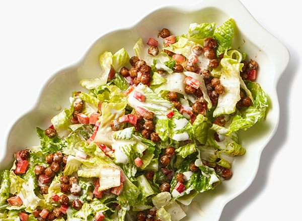 - Transfer chickpeas to mixing bowl; stir in peppers, dressing, and romaine, and toss to coat. Serve.