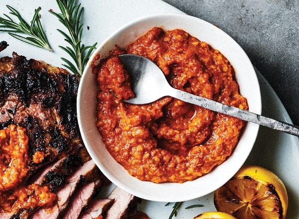- Combine in bowl of food processor: roasted garlic cloves, raw garlic cloves, bread, and almonds. Pulse until finely chopped. Add tomatoes and pepper flesh; pulse until thick, rough paste forms. Add oil, vinegar, and salt and pulse until emulsified. (Makes 2 cups)