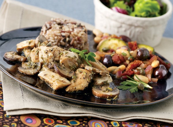 - Combine sugar, salt, and pepper in medium bowl. Cut chicken into 1-inch cubes; add to sugar/salt mixture (wash hands); toss until evenly coated. Arrange chicken in single layer in 2-quart baking dish. Sprinkle mushrooms and rosemary over chicken.