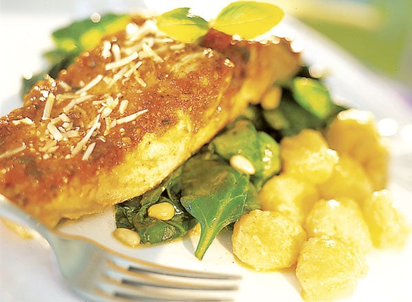 - Meanwhile, preheat second large sauté pan on medium-high 2–3 minutes. Place remaining 1 tablespoon oil in pan, then add spinach; cover and cook 2–3 minutes, stirring occasionally, or until spinach is wilted and tender. Serve fish and sauce over spinach.
