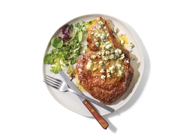 - Meanwhile, coat grill rack with spray and preheat grill (or grill pan) on medium. Cut remaining 3 tablespoons butter into small pieces; add cubed butter, blue cheese, and thyme to melted butter–garlic mixture and stir until well blended. Chill until ready to serve.