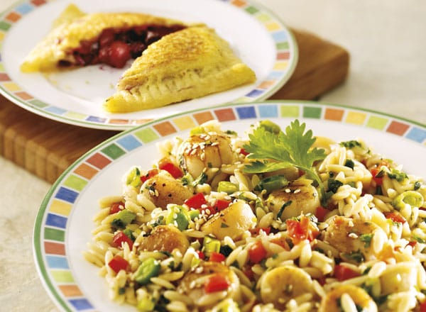 - Stir in bell pepper, onions, peas, cilantro, vinaigrette, and scallops; reduce heat to low and cook 1–2 minutes or just until scallops are opaque, and vegetables are crisp-tender. Remove from heat; top with sesame seeds (if desired) and serve.