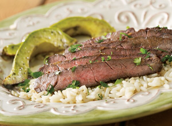 - Transfer avocados to serving dish; drizzle with any juices and oil from baking dish. Slice steak; drizzle with lime juice and sprinkle with cilantro. Serve.