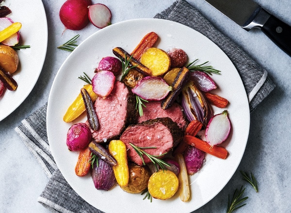 - To serve, slice lamb into medallions and serve with vegetables on the side.