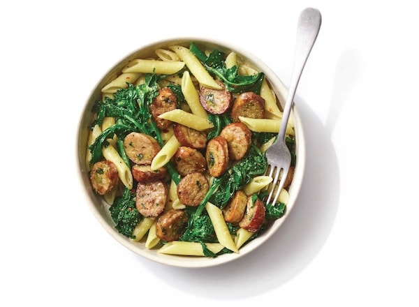 - Add baby broccoli, sausage, pasta water, and remaining 1 teaspoon salt; cook and stir 1 minute until baby broccoli is tender. Add pasta; cook and stir 1 more minute until well blended. Top with cheese, if using. Serve.