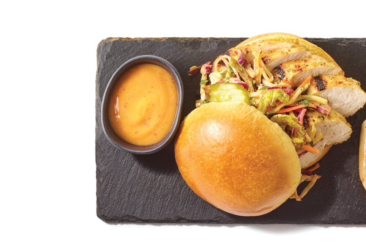 - Slice chicken and divide among bottom halves of buns. Top with pickle chips and coleslaw; drizzle with remaining ¼ cup sauce mixture. Top with fried jalapeños and top halves of buns. Serve.