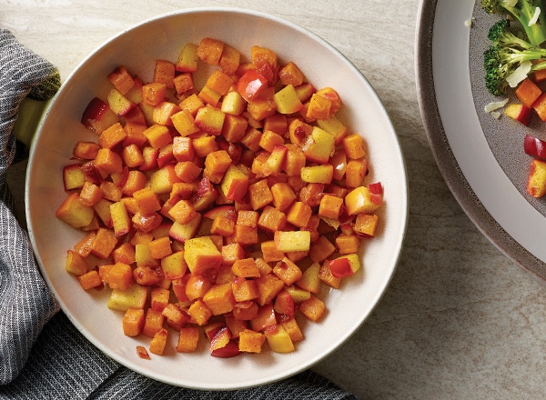 - Peel sweet potatoes and apple; cut into ½-inch cubes. Place potatoes in microwave-safe bowl; cover and microwave on HIGH for 4 minutes or until potatoes begin to soften. Meanwhile, peel and chop onion (½ cup).