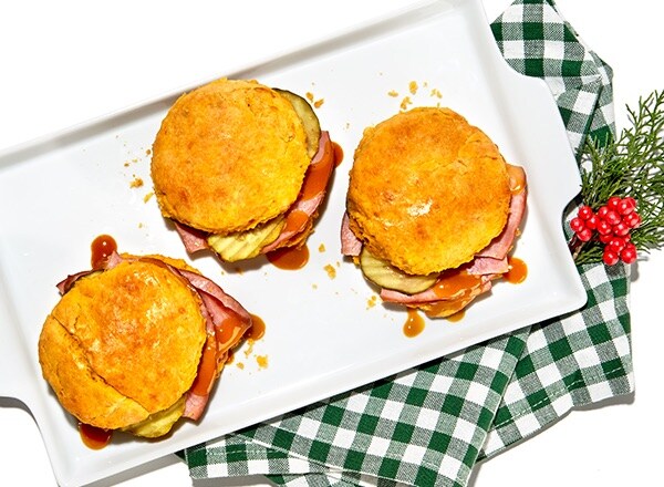 - Heat ham and barbecue sauce following package instructions, if desired. Split open biscuits; place bottom halves on work surface and top evenly with ham, pickles, and barbecue sauce. Complete with top halves of biscuits and serve.