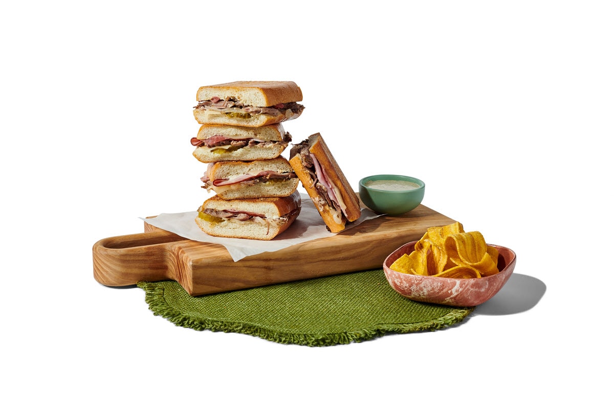 - Spread pork mixture over cheese. Drizzle remaining 2 tablespoons mayonnaise mixture over pork, then top evenly with ham, salami, and remaining half cheese; place top half of loaf cut-side-down on sandwich.