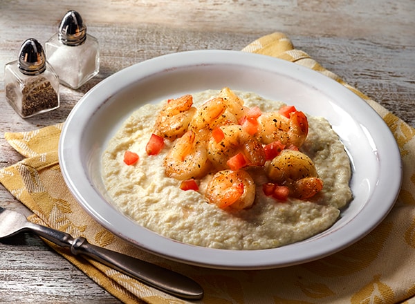 - Remove pan from heat; stir in butter until melted. Serve shrimp over creamy corn; top with tomatoes. Serve.