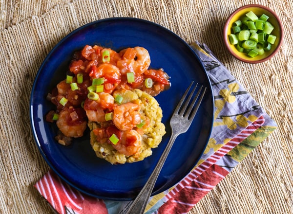- Peel and mash plantains; stir in mojo marinade, remaining 2 tablespoons garlic, and remaining 1 teaspoon seasoning. Form mixture into 6 balls; press to flatten slightly. Serve shrimp and sauce over plantains, topped with green onions.