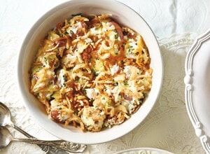 Amount per ⅛ recipe serving: Calories 230, Total Fat 13g, Sat Fat 6g, Trans Fat 0g, Chol 25mg, Sodium 320mg, Total Carb 21g, Fiber 0g, Sugars 1g, Protein 6g, Calc 10%, Vitamin A 6%, Vitamin C 35%, Iron 6%