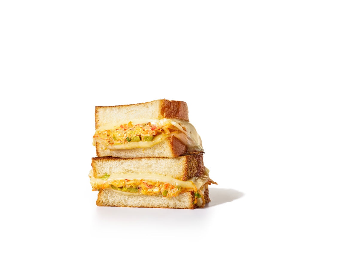 - Assemble sandwiches in this order: bottom slice bread, 2 slices American cheese, 4 jalapeño slices, ½ cup dip mixture, 2 slices mozzarella cheese, and top slice of bread.