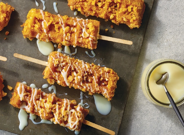 - Coat waffle sticks with spray; bake 10 minutes. Flip waffles, then bake 8–10 more minutes until crispy; let stand 5 minutes to cool. Drizzle with condensed milk before serving.