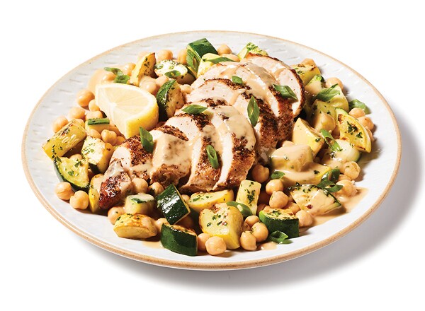 - Slice chicken, arrange over vegetables, and drizzle with tahini. Top with green onions and parsley; serve with lemon wedges.